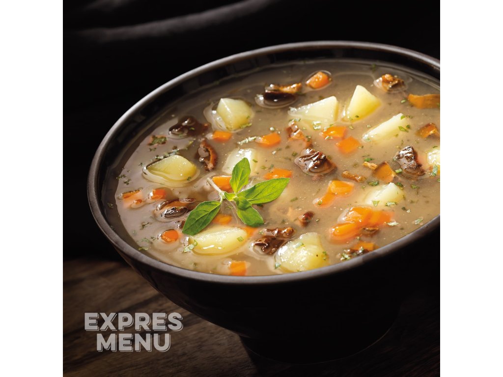 Složení: voda, brambory (8 %), směs polévkové zeleniny (mrkev, hrášek, květák, brokolice, kapusta, kedlubna), rýžová mouka, kukuřičná mouka, řepkový olej, cibule, sušené houby, česnek, sůl kamenná, majoránka, pepř, kmín.