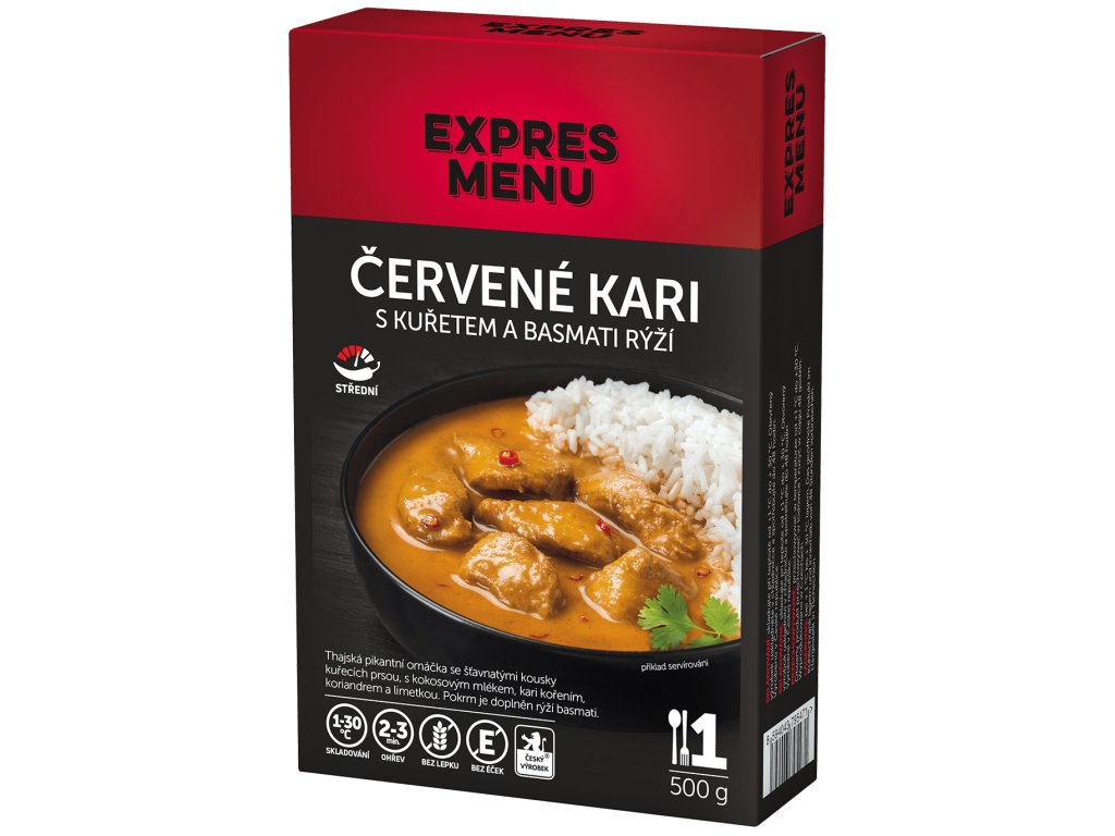 Vydejte se do světa thajských chutí s červeným kari s kuřetem a basmati rýží od EXPRES MENU. Jemně pikantní omáčka z červeného kari koření a kokosového mléka obklopuje kousky šťavnatého kuřecího masa, doplněné voňavou rýží basmati — dvě porce hotové pohody. Bez lepku, plné aroma, stačí jen ohřát a servírovat.