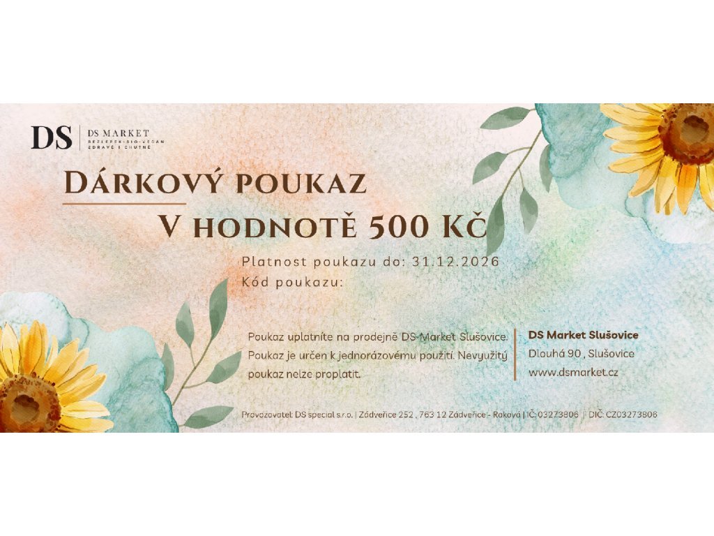 Upozornění: dárkový poukaz uplatníte při nákupu v eshopu www.dsmarket.cz po zadání slevového kódu nebo předložením na pokladně v prodejně DS Market ve Slušovicích. Nevyužitý dákový poukaz nelze proplatit. Dárkový poukaz je určen k jednorázovému použití.