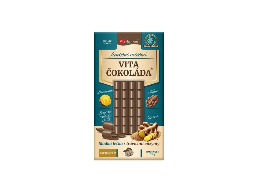 VitaČokoláda® spojuje jemnou chuť mléčné čokolády s 36% podílem kakaa a funkčními rostlinnými složkami – zázvorem, kmínem a enzymem bromelainem. Tyto přírodní ingredience jsou ceněny pro své tradiční využití v péči o zažívání a komfort po jídle.VitaČokoláda® spojuje jemnou chuť mléčné čokolády s 36% podílem kakaa a funkčními rostlinnými složkami – zázvorem, kmínem a enzymem bromelainem. Tyto přírodní ingredience jsou ceněny pro své tradiční využití v péči o zažívání a komfort po jídle.