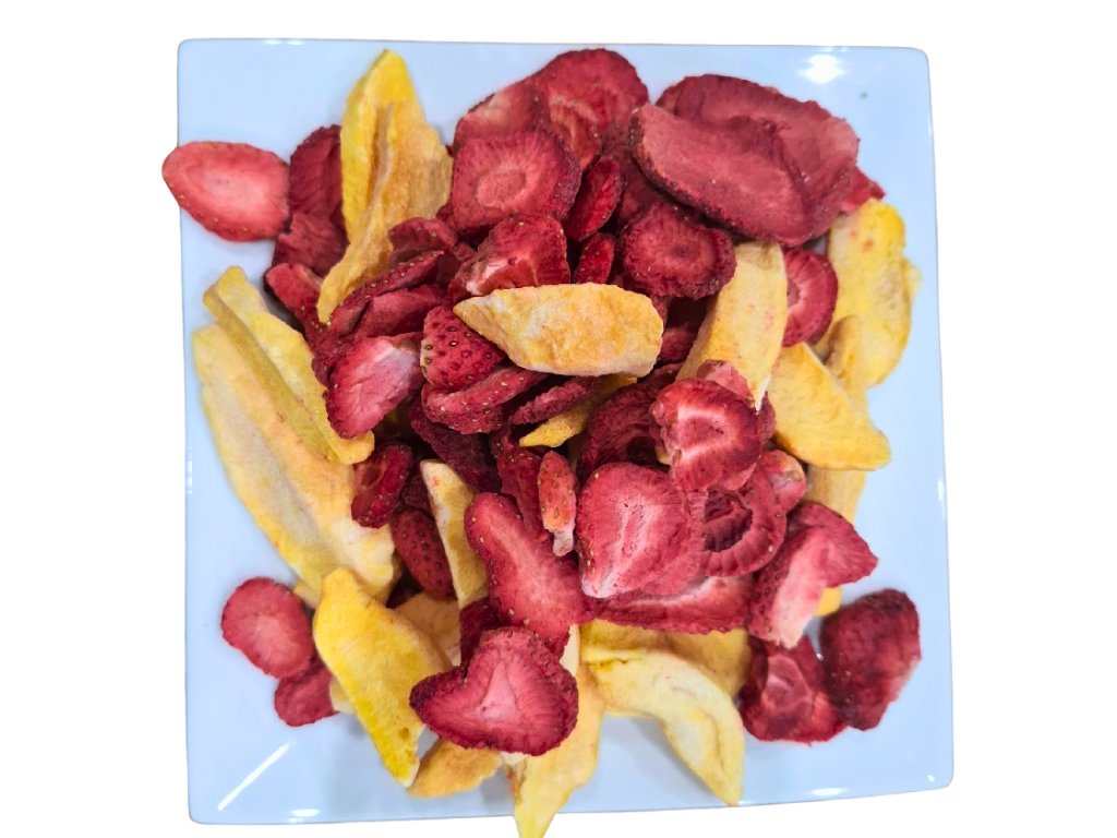 Kombinace jahod a manga sušených mrazem představuje zdravý, křupavý a přirozeně sladký snack, který si zamilujete. Díky šetrnému sušení mrazem (lyofilizaci) si ovoce zachovává svou barvu, vůni, chuť i většinu vitamínů a minerálů.
