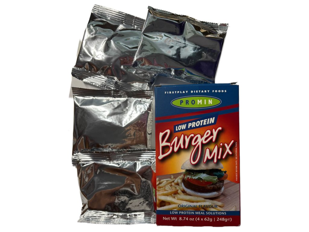 Sypká směs nízkobílkovinná náhražka hamburgeru (248 g) od výrobce Promin PKU je určena pro osoby na nízkobílkovinné dietě, včetně pacientů s fenylketonurií (PKU). Balení obsahuje 4 samostatné sáčky po 62 g — každý sáček obvykle vytvoří dvě porce hamburgeru. Produkt představuje praktickou alternativu klasických hamburgerů s důrazem na nízký obsah bílkovin.