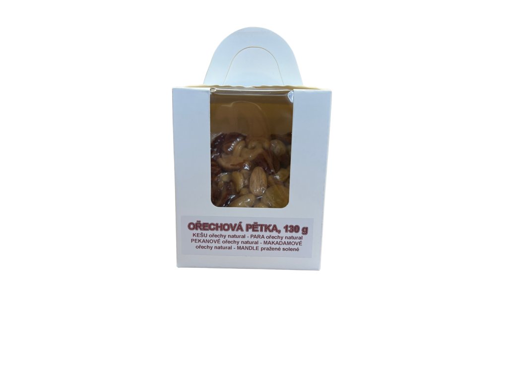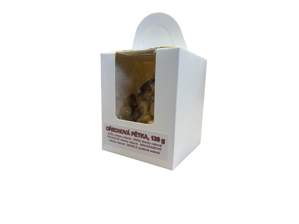 Složení: 30 g KEŠU ořechy, 25 g MAKADAMOVÉ ořechy, 25 g PEKANOVÉ ořechy, 25 g PARA ořechy, 25 g MANDLE solené pražené