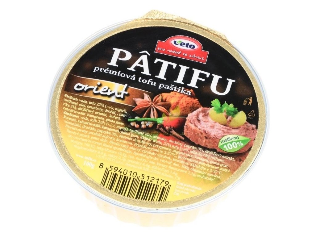 Premiová tofu paštika s orientálním kořením. Vyniká velmi jemnou konzistencí a výbornou, vyváženou chutí, která připomíná masnou paštiku. Praktické balení v ALU misce lze snadno otevřít a paštiku pohodlně nabírat. Další výhodou paštik PATIFU je dlouhá trvanlivost při teplotě 25°C. Tato trvanlivost je dosažena pouze díky sterilování (tzn. zahřátí výrobku na cca 120°C). Paštiky PATIFU neobsahují žádné konzervanty! Paštiky PATIFU nemusí být v lednici a proto se nabízí jako zdravá svačinka na výlety, do školy či práce, na dovolenou apod.