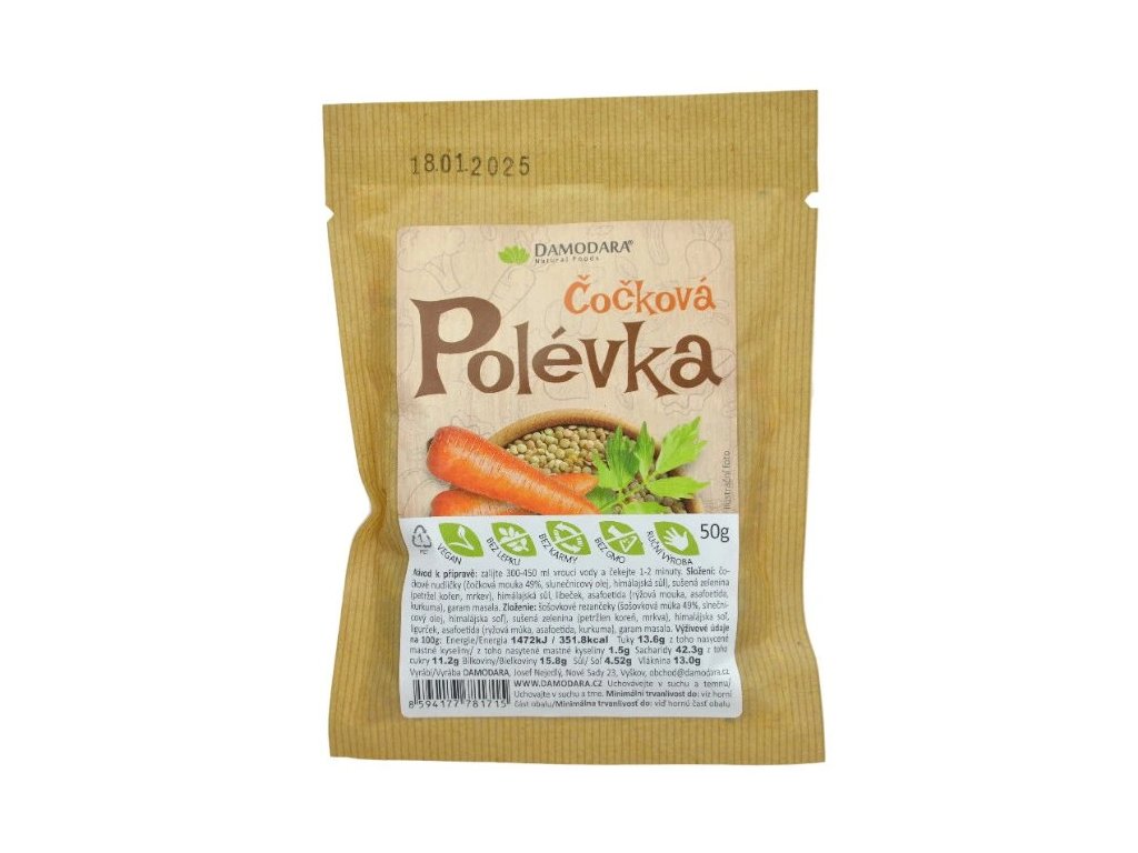 Složení: čočkové nudličky (čočková mouka 49 %, slunečnicový olej, himálajská sůl), sušená zelenina (petržel kořen, mrkev), himálajská sůl, libeček, asafoetida (rýžová mouka, asafoetida, kurkuma), garam masala