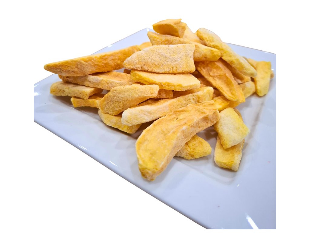 - Mrazem sušené (lyofilizované) – proces, který zachovává maximum chuti, vůně a živin; mango tak chutná intenzivně a autenticky.
