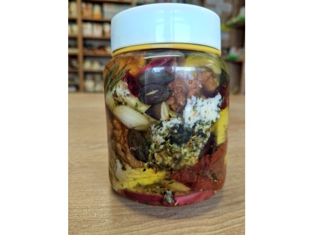 Složení: extra panenský olivový olej, slunečnicový olej, niva (MLÉKO, jedlá sůl, mlékařské kultury, ušlechtilá plíseň Penicillium roqueforti) sušená rajčata, vlašské OŘECHY, olivy, sušené brusinky, dýňová semínka, česnek, červená cibule, nové koření, zelený pepř, růžový pepř, grilovací koření s řasou nori a směsí květů, rozmarýn