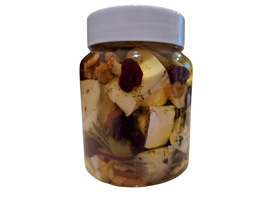 Složení: extra panenský olivový olej, slunečnicový olej, hermelín bez laktózy (MLÉKO bez laktózy, jedlá sůl, mlékařské kultury) sušená rajčata, vlašské OŘECHY, olivy, sušené brusinky, dýňová semínka, cibule červená, cibule bílá, česnek, nové koření, zelený pepř, růžový pepř, grilovací koření s řasou nori a směsí květů, rozmarýn.